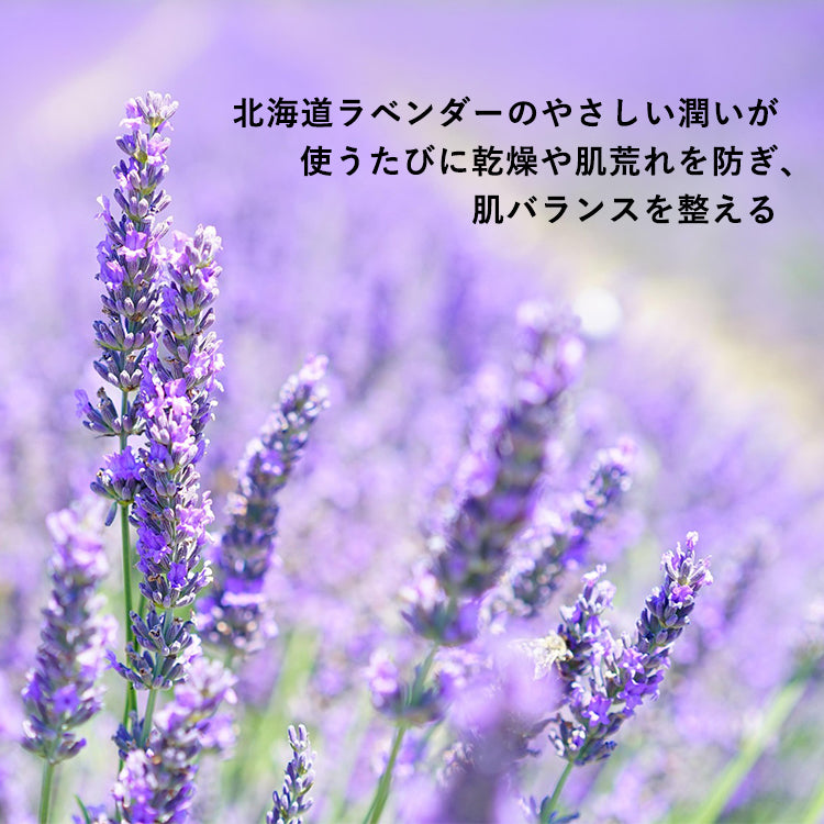 [北海道産]ラベンダー花エキスが肌のバランスを整え、[北海道産]甜菜から採れるラフィノースが潤いある健やかな肌を保ちます。インナードライ肌にうるおいを与え、暑い夏も、寒い冬も、季節を問わずに使いやすいテクスチャー。北海道自然あふれるの花畑の恵みを、一年中肌で感じることができます。