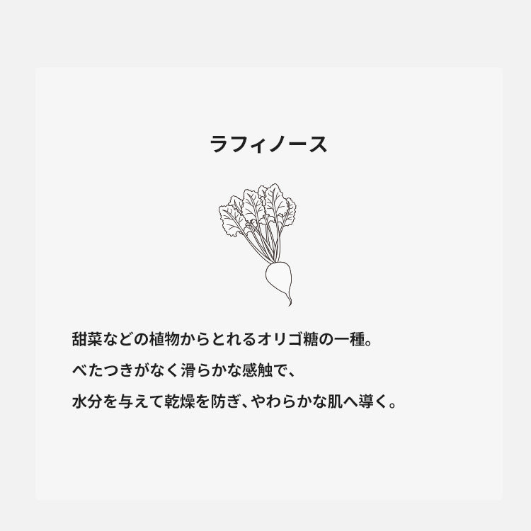 北海道産ラベンダー花エキス配合。北海道の寒暖差のある厳しい自然の中で育ったシソ科の植物、ラベンダーの花から抽出したエキスが、肌を保湿して水分のバランスを整えます。さらに、北海道産甜菜由来のオリゴ糖(ラフィノース)が、潤いのある健やかな肌を保ちます。