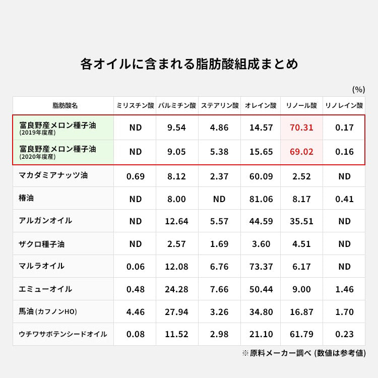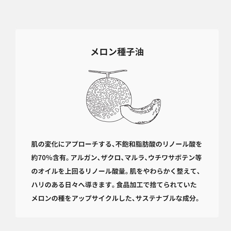 メロン種子油は、年齢による肌の変化にアプローチするリノール酸を約70%含有(原料メーカー調べ)。アルガン、ザクロ、マルラ、ウチワサボテン等のオイルを上回るリノール酸量。リノール酸とは、体内で作ることができない不飽和脂肪酸の一種でスキンケアとして使用することで肌をやわらかく、ハリのある日々へ導きます。