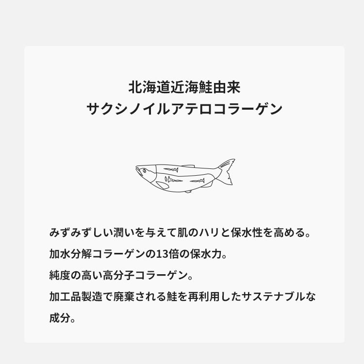 みずみずしい潤いを与えて肌のハリと保水性を高める、Ⅰ型・Ⅱ型・Ⅴ型コラーゲンで構成される北海道近海鮭由来のサクシノイルアテロコラーゲンを配合。加水分解コラーゲンの13倍の保水力と言われる、純度の高い高分子コラーゲンです。真皮コラーゲンとも呼ばれるアテロコラーゲンは、皮膚に存在するⅢ種類のコラーゲンから成る美容成分。肌の水分蒸発を抑えて乾燥を防ぐことで、うるおいを保ちます。毎日数回、乾燥で肌の疲れを感じたときにミストケアすることで、みずみずしさをキープし肌のハリと保水性を高めます。加工品製造で廃棄される鮭を再利用したサステナブルな成分という一面も。