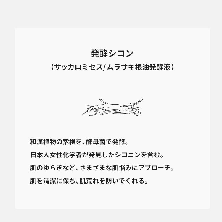和漢植物の紫根(シコン)を酵母菌で発酵させた発酵シコン。日本人女性化学者が発見した、天然成分シコニンが含まれており、肌のゆらぎなど、さまざまな肌悩みにアプローチしながら、肌のキメを整え清潔に保ち、肌荒れを防いでくれます。