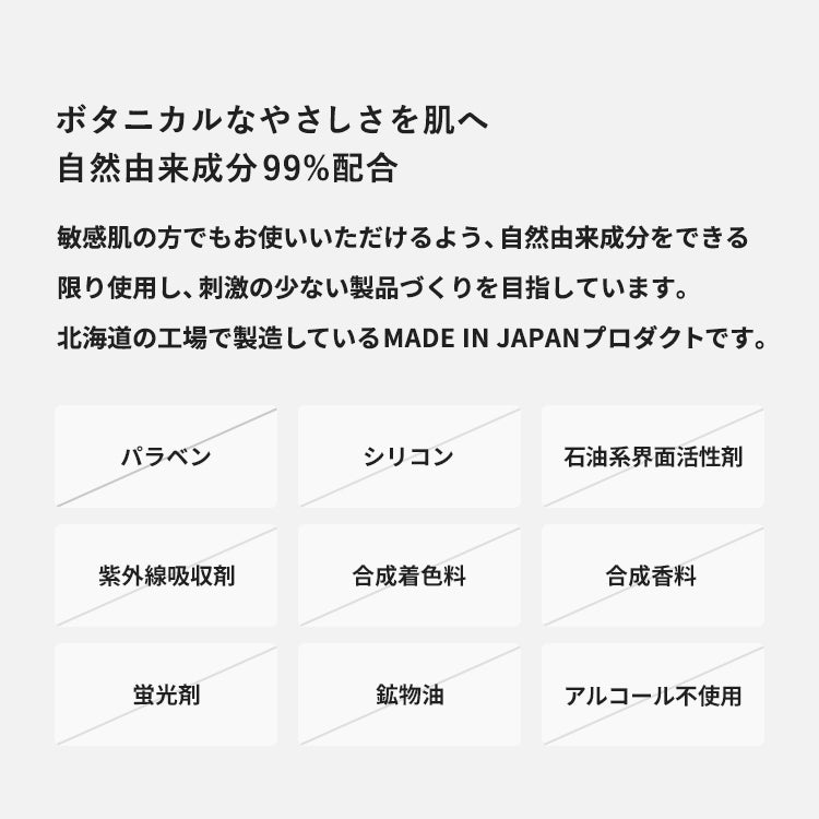北海道の美しい水とあわせる成分を探していく中で、冬の寒さに耐える力強さを秘め、同じ北海道の大地と水に育まれた素材にたどり着きました。素材ひとつひとつが持つ本来の魅力を引き出すことを大切に、わたしたちの身体にも、恵みをもたらしてくれる大地にも優しい方法を選択した結果です。また、北海道の工場で商品を製造することで原料の輸送距離を短縮するなど、サスティナブルな商品造りも心がけています。