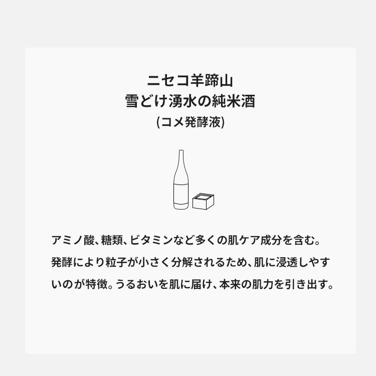 酒蔵で働く蔵人の肌は白くて美しいという話しや、スキンケア用品が売られていなかった時代は日本酒を化粧水がわりに使っていたという話もあり、日本酒はまさに古来の知恵を活かしたスキンケア成分。うるおいを肌に届け、本来の肌力を引き出します。