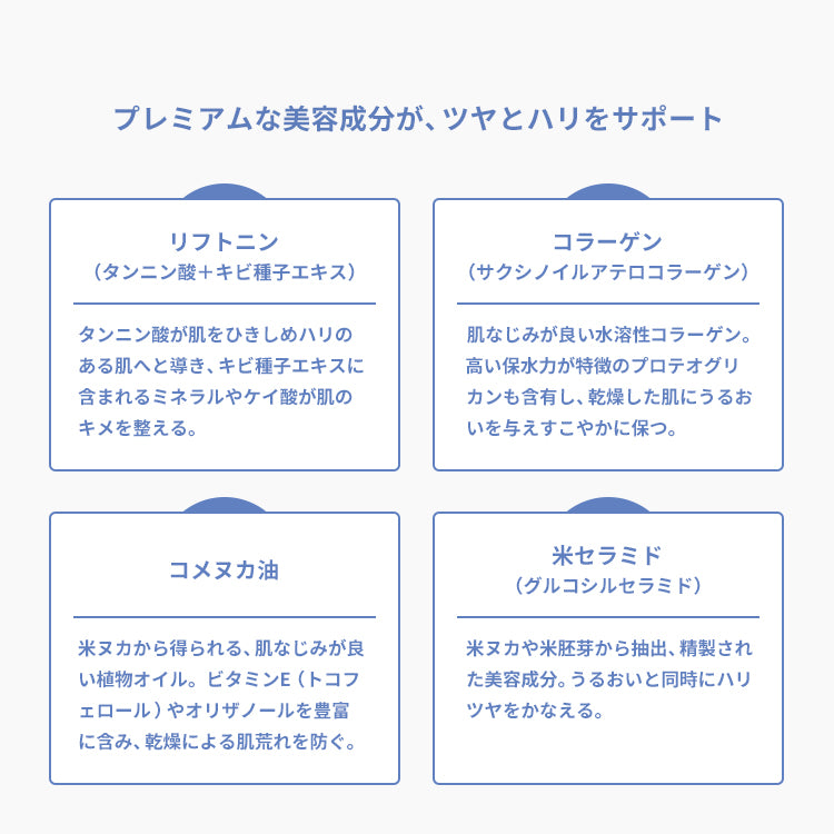 - リフトニン(タンニン酸+キビ種子エキス):肌なじみが良い水溶性コラーゲン。高い保水力が特徴のプロテオグリカンも含有し、乾燥した肌にうるおいを与えすこやかに保つ。