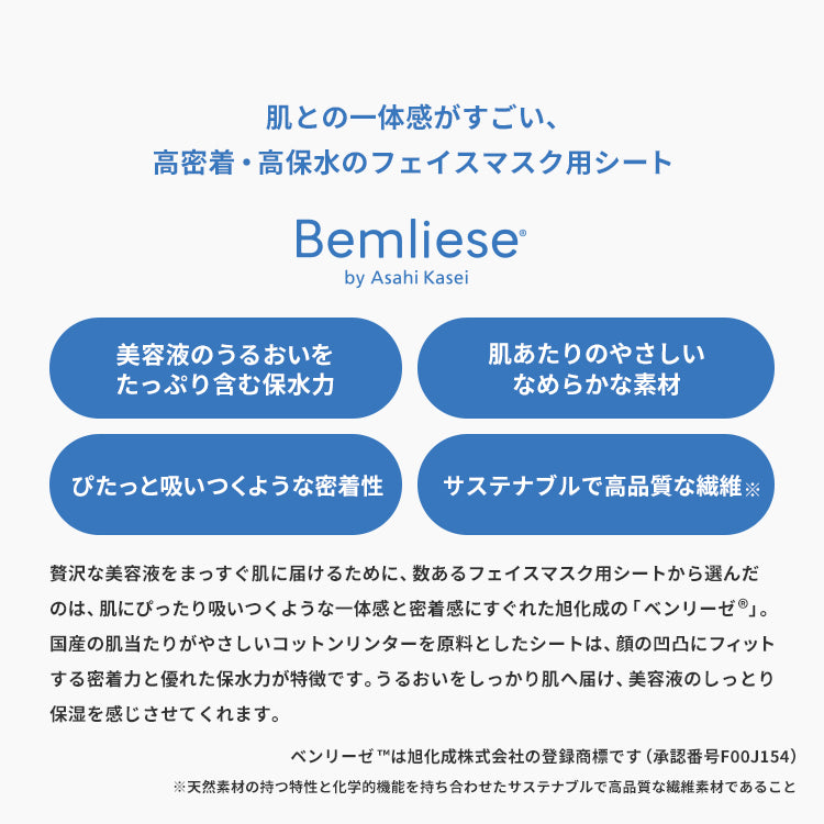 顔の凹凸に沿うようにフィットし、吸いつくような独特な感触。15分間つけていても顔からはがれづらく、うるおいをしっかり肌へ届けます。 - 肌にやさしいなめらか素材: