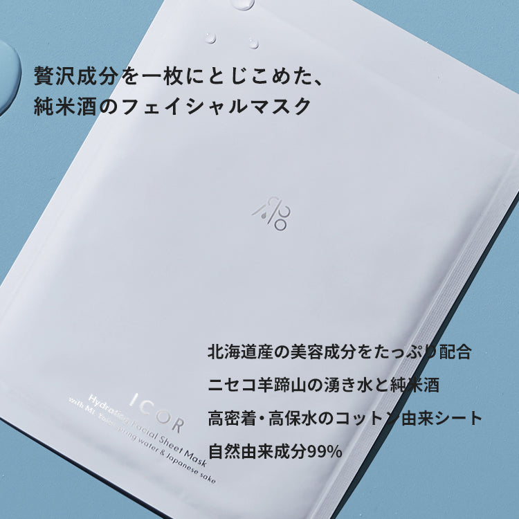 ICORのSakeフェイシャルマスクは、美しい水で肌表面の角質層をやわらかくほぐし、美容成分をしっかりと肌へ届ける贅沢なスキンケアアイテム。肌力をサポートする成分をたっぷり配合しました。ムラなくすみずみまで肌をうるおすために、まるで肌と一体化したようにフィットするシートを採用。この一枚で肌の集中ケアを叶えます。
