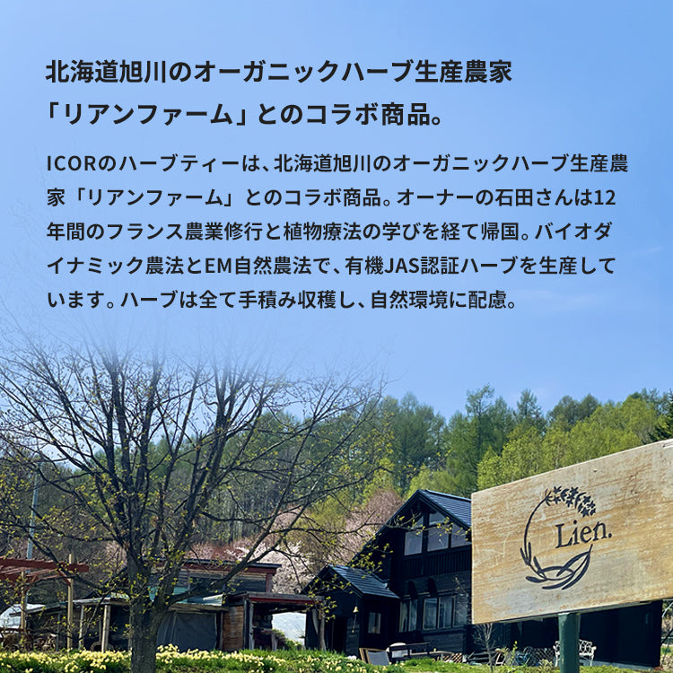 ICOR NISEKOのオリジナルハーブティーは、北海道旭川のオーガニックハーブ生産農家「リアンファーム」とのコラボ商品。オーナーの石田さんは12年間のフランス農業修行と植物療法の学びを経て帰国。バイオダイナミック農法とEM自然農法で、有機JAS認証ハーブを生産しています。ハーブは全て手積み収穫し、自然環境に配慮。フランスのオーガニックハーブ生産者と直接連携し、世界クオリティーのハーブを提供している生産者です。https://www.lienfarm.com